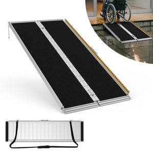 FODINGHILL Portable Aluminum Wheelchair Ramp - Unlock the new possibilities of barrier-free travel for you.This foldable ramp is specially designed for a convenient life, featuring both durability and ease of operation. Whether for daily use or carrying around, it can handle everything with ease, making every trip more relaxed and comfortable. The innovative foldable design makes storing the ramp no longer a problem. When folded, the structure is compact, significantly saving space, and can be easily placed in the car trunk or carried to public transportation areas, providing assistance for barrier-free travel at any time. Made of high-strength industrial aluminum, it is sturdy and reliable, capable of handling various usage scenarios. The anti-slip surface design effectively enhances friction, providing you with a smooth and safe passage. The ramp is equipped with high-quality stainless steel hinges, opening smoothly and being durable. The reinforced support ribs are doubly reinforced by welding and rivets, ensuring structural stability and making use more reassuring. No complex operations are required; simply unfold and use. The placement is simple and quick. With the additional long screws, it further strengthens the connection, remaining firm even after long-term use. We offer multiple size options and can recommend the most suitable model based on your actual usage scenarios to ensure that every user can enjoy the best experience. A practical handle is specially configured for easy carrying and moving. Whether for home use or accompanying someone out, it can be easily transferred, allowing barrier-free assistance to be carried out at any time.