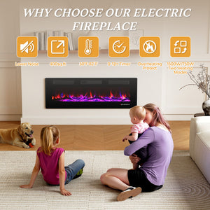 This modern and stylish wall-mounted electric fireplace is not only an efficient home heating device, but also an elegant decorative art piece. It is equipped with a full-spectrum LED color system and simulated flame visual effects, which can easily create a warm and soothing atmosphere and add a unique charm to your home. The product has passed ETL safety certification and is equipped with an overheat protection function, providing comprehensive safety protection for you and your family. It offers two power options: 750 W and 1500 W, capable of warming up approximately 400 square feet of space. To ensure safety, do not place flammable items such as quilts, books, and clothes near the device, and keep a distance of at least 1 meter from combustible materials. Choose this electric heater to easily create a warm and comfortable home environment and enjoy every moment with peace of mind.