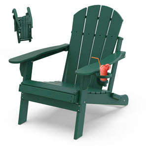 Outdoor Folding Adirondack Chair, HDPE All Weather Patio Chair with Cup Holder for Deck Backyard Garden, Dark Green