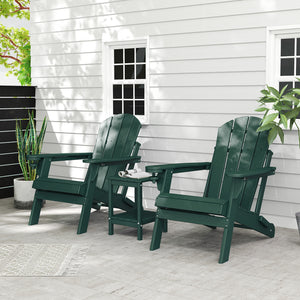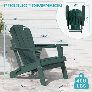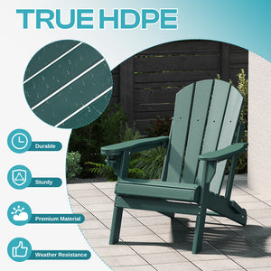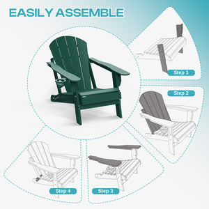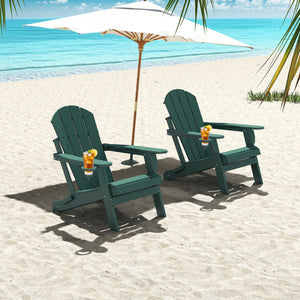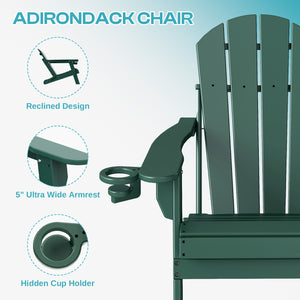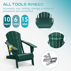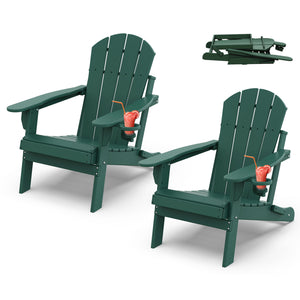Outdoor Folding Adirondack Chair set of 2, HDPE All Weather Patio Chair with Cup Holder for Deck Backyard Garden, Dark Green