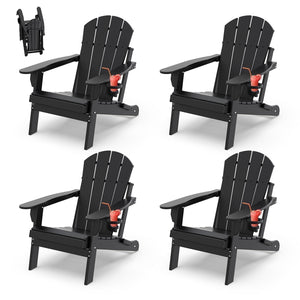 PIPOPA Outdoor Folding Adirondack Chair Set of 4, HDPE All Weather Patio Chair with Cup Holder for Deck Backyard Garden, Black