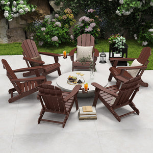 Outdoor Folding Adirondack Chair set of 6, HDPE All Weather Patio Chair with Cup Holder for Deck Backyard Garden, BrownWood