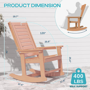 - 🔥【Ergonomic & Comfortable】UPGRADED rocking chair is perfectly designed for indoors or out. Slatted high back & seating design sheds rainwater and dries quickly. 120°elevation allows you to have a wonderful rocking.